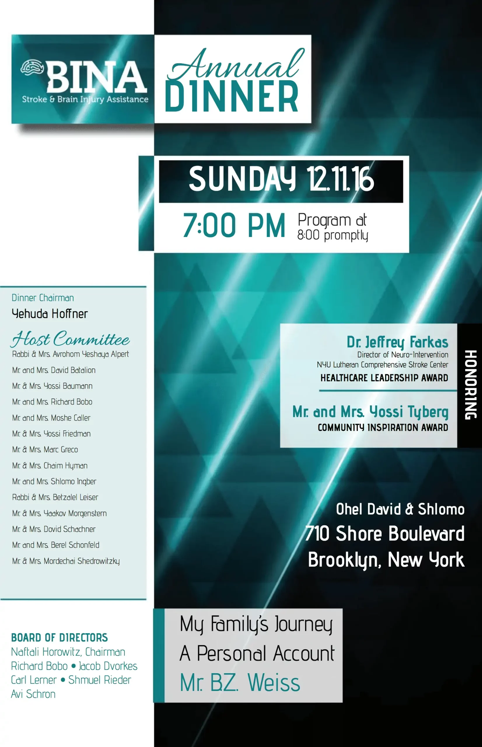 Admirers of BINA’s lifesaving work, and family, friends and colleagues of the honorees, gathered at the Ohel David & Shlomo hall..