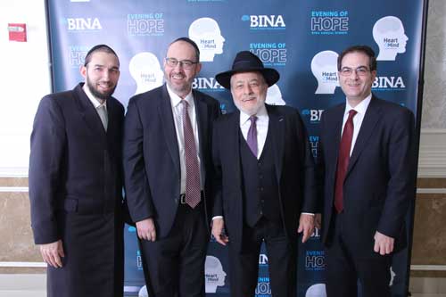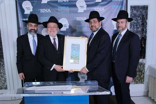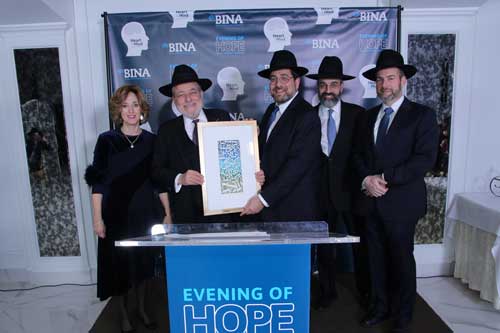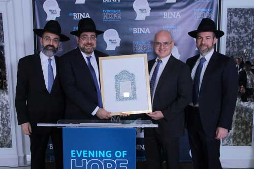 The Annual Dinner of BINA Stroke and Brain Injury Assistance took place at El Caribe Country Club in Brooklyn last Sunday. Honored at the gala event were Dr. Steven Kirshblum, Senior Medical Officer at Kessler Institute for Rehabilitation in New Jersey, who was presented with the Physician Leadership Award; Natalie and David Batalion, longtime friends and supporters of BINA, who received the Visionary Partners Award; and Elchanan Schwarz, Director of Crisis Intervention at BINA and well-deserving recipient of the Distinguished Community Service Award.