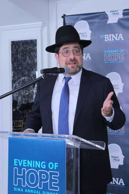 The final speaker was Rabbi Aaron Gancz who described his personal experiences following the devastating illness of a close family member. He stated the staff of BINA not only has the knowledge to offer priceless guidance and advice but also a binah yeseirah, extra measure of understanding, of what families go through. He concluded by appealing to the crowd to provide BINA with the necessary support to allow them to continue giving.